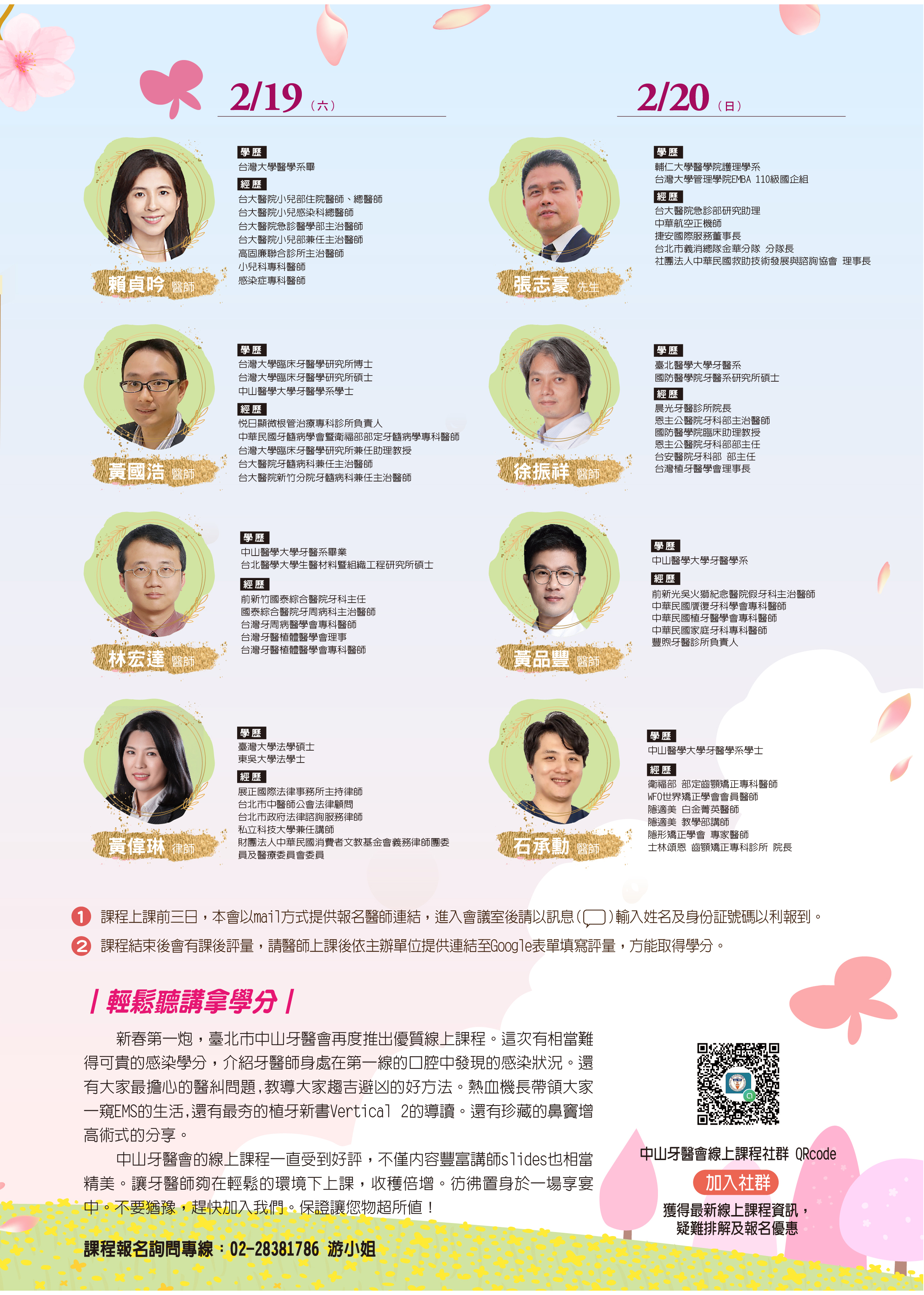 各位醫師,學員好: 【點擊圖片放大】 【點擊圖片放大】 2/19(六)~ 2/20(日),最優質認真的講師陣容